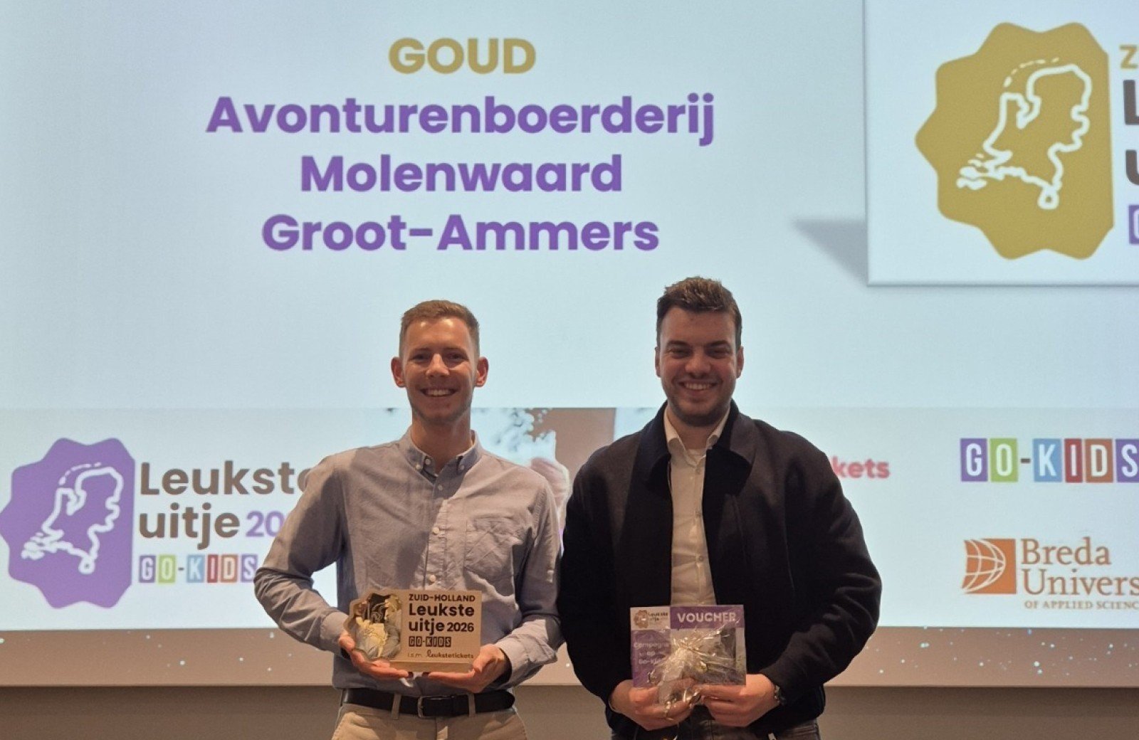 Avonturenboerderij Molenwaard is tijdens de vakbeurs Dagrecreatie Live uitgeroepen tot ‘Leukste Uitje van Zuid-Holland’. Na een publieksstemming via Go-Kids en een beoordeling door een vakjury werd het themapark van Fien & Teun bekroond op basis van onder andere gastbeleving, gastvrijheid, prijs-kwaliteitverhouding, entertainment en duurzaamheid. Een prachtige erkenning vanuit zowel het publiek als de branche. De award voor 'Het leukste uitje' is een een doorontwikkeling van het bekende initiatief van ANWB, dat de Avonturenboerderij eerder maar liefst zes keer achter elkaar wist te winnen.